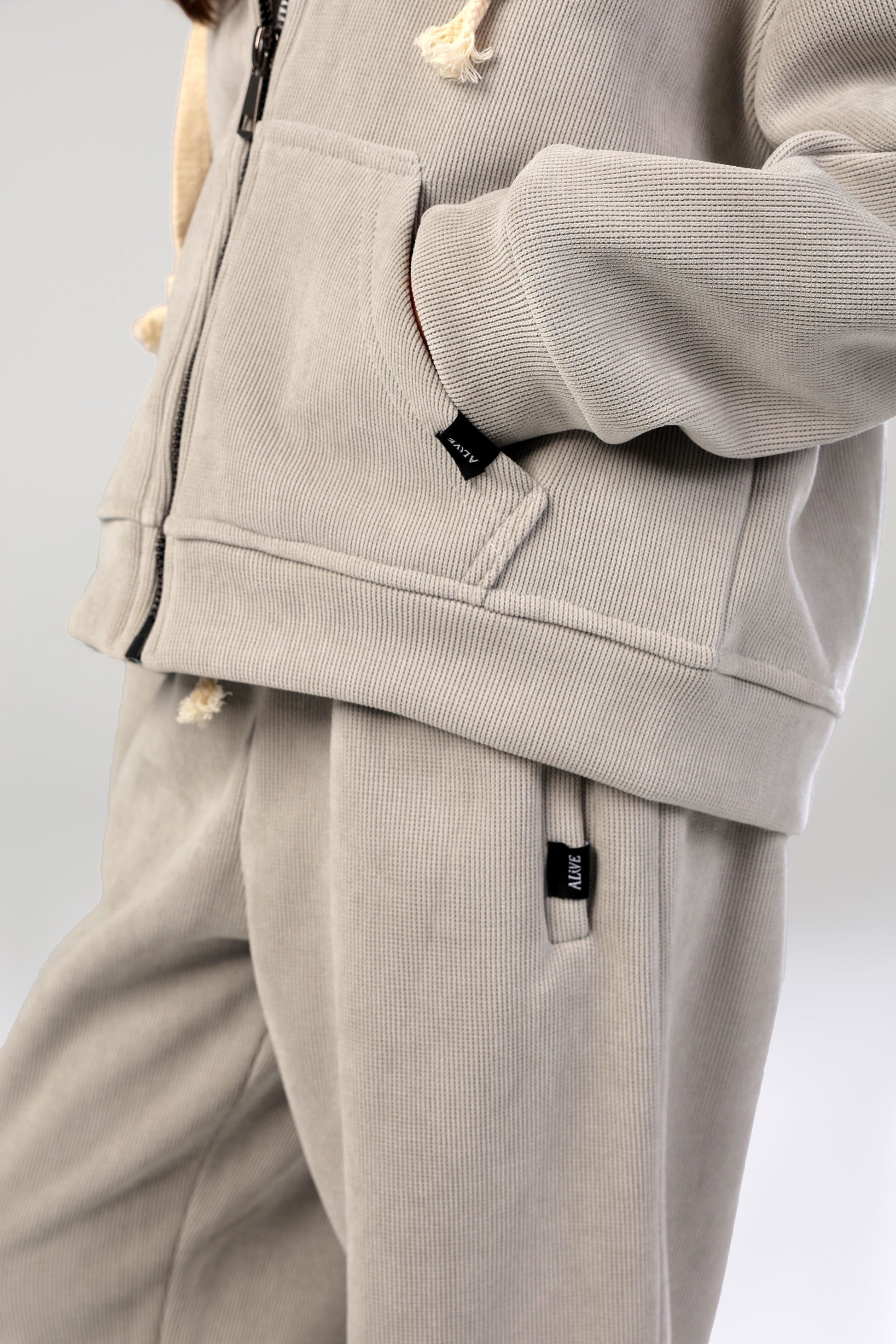 The set includes a full-zip hoodie featuring a cozy hood with contrast cream drawstrings and a relaxed fit, paired with matching wide-leg sweatpants that also feature an adjustable drawstring waist for a perfect fit. Whether for active days or chill-out time, this set is a go-to for comfort and modern style.